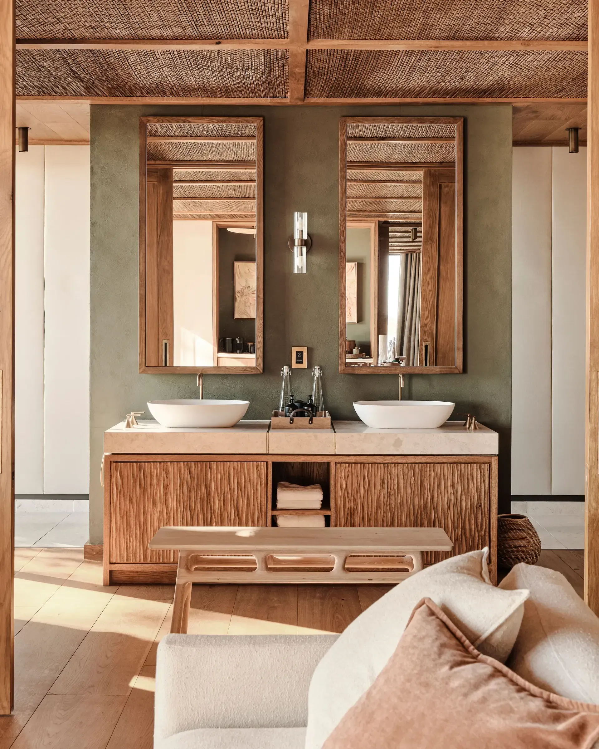 As nomadic stewards of the land, the Maasai have long understood how to exist alongside nature without disrupting it, a philosophy deeply embedded in the design of Kitirua Plains Lodge. Newly built in 2025-26, it is not only the latest addition to the A&K Sanctuary portfolio but also one of the most architecturally arresting – conceived not to mimic its environment but to meld unobtrusively with it. Curved walls and fluid rooflines echo the undulating terrain and the exterior plaster is blended with soil from the site to create harmony in texture and color. Even the pool, flanked by an earth-toned terrace of day beds, sits neatly within a patch of existing wetland.