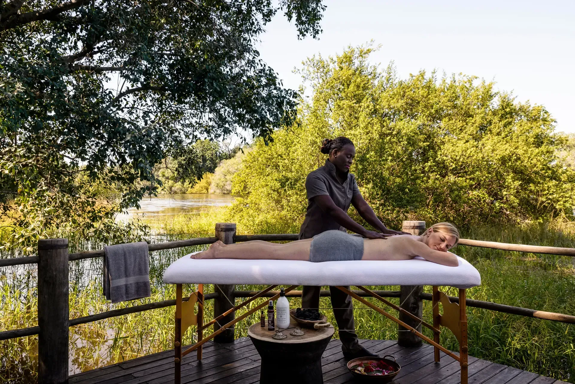 A heated swimming pool and a gym are set within an oasis that has been rewilded by staff and guests over the past decades. In the gardens, the chef grows organic ingredients for delicious farm-to-fork lunches and dinners served in the boma, a cool open-air lounge overlooking the river, where hippos wallow in the shade of acacias and iridescent hummingbirds flit across the water.