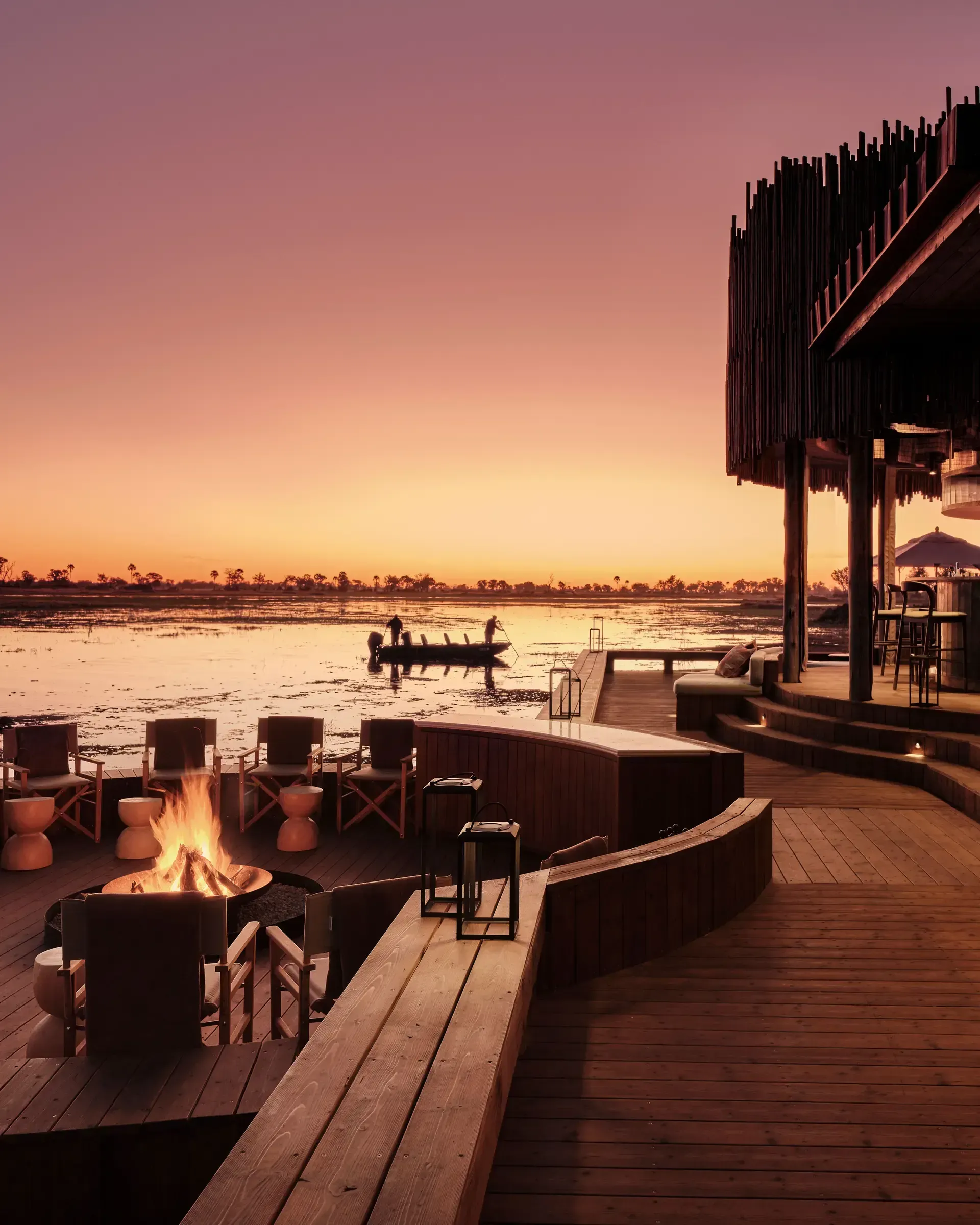 Though its rich royal heritage is referenced throughout, the camp today embraces a contemporary take on classic safari style. Wood is used generously, from the jackalberry logs hollowed out to make the traditional mokoros, to the whitewoods used to fashion the main bar where sundowners are served. Tactile woven rugs and sumptuous seating soften the living areas, with beaded chandeliers and wall-hangings rooting the decor in local craftsmanship. Accommodation is in 10 private thatched pavilions and the two-bedroom Geoffrey Kent Suite – all of which have their own private wraparound terrace with a close-to-nature outdoor shower, a plunge pool and panoramic views, so wildlife sightings are never far away. And if the sights and sounds of the Okavango aren’t soothing enough, the on-site spa offers environmentally conscious Africology treatments, rejuvenating facials, and therapeutic remedies to help guests fully unwind.