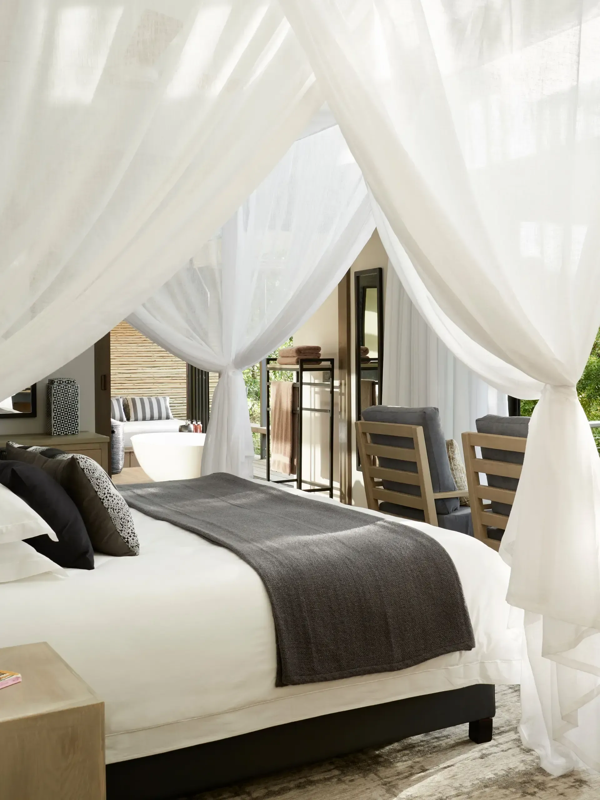 Each spacious thatched suite has a super king-sized bed with high-thread count linens and mosquito net canopies, ensuite bathroom with double vanity, rain shower and freestanding bathtub, top-drawer products and bathrobes, and plus a private deck with scenic views.