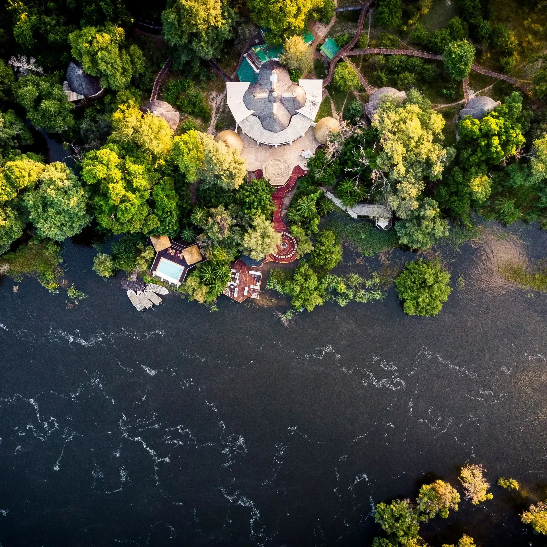 - Just seven miles upstream from Victoria Falls on a quiet bend of the Zambezi River away from the crowds