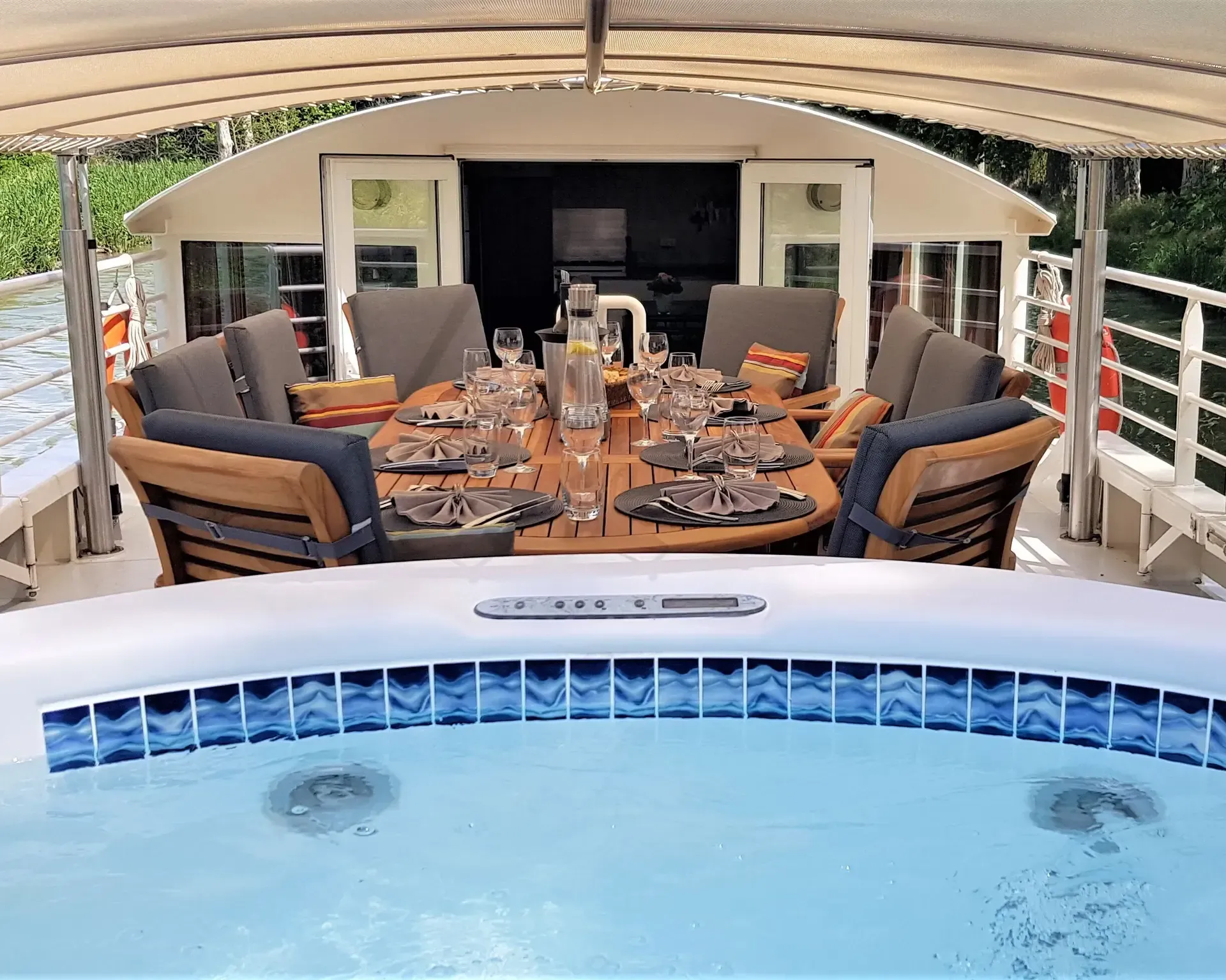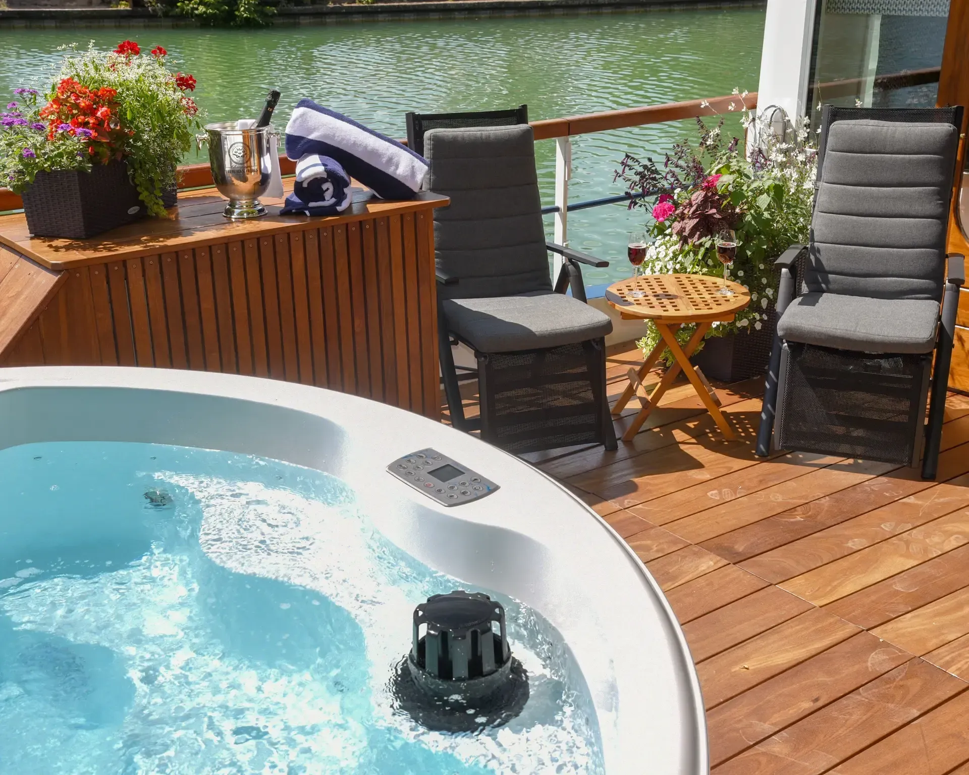 Crew of six ensures your comfort on board. Ride one of the provided bicycles along the towpath. The sun deck is partially shaded for open-air dining and features a heated plunge pool