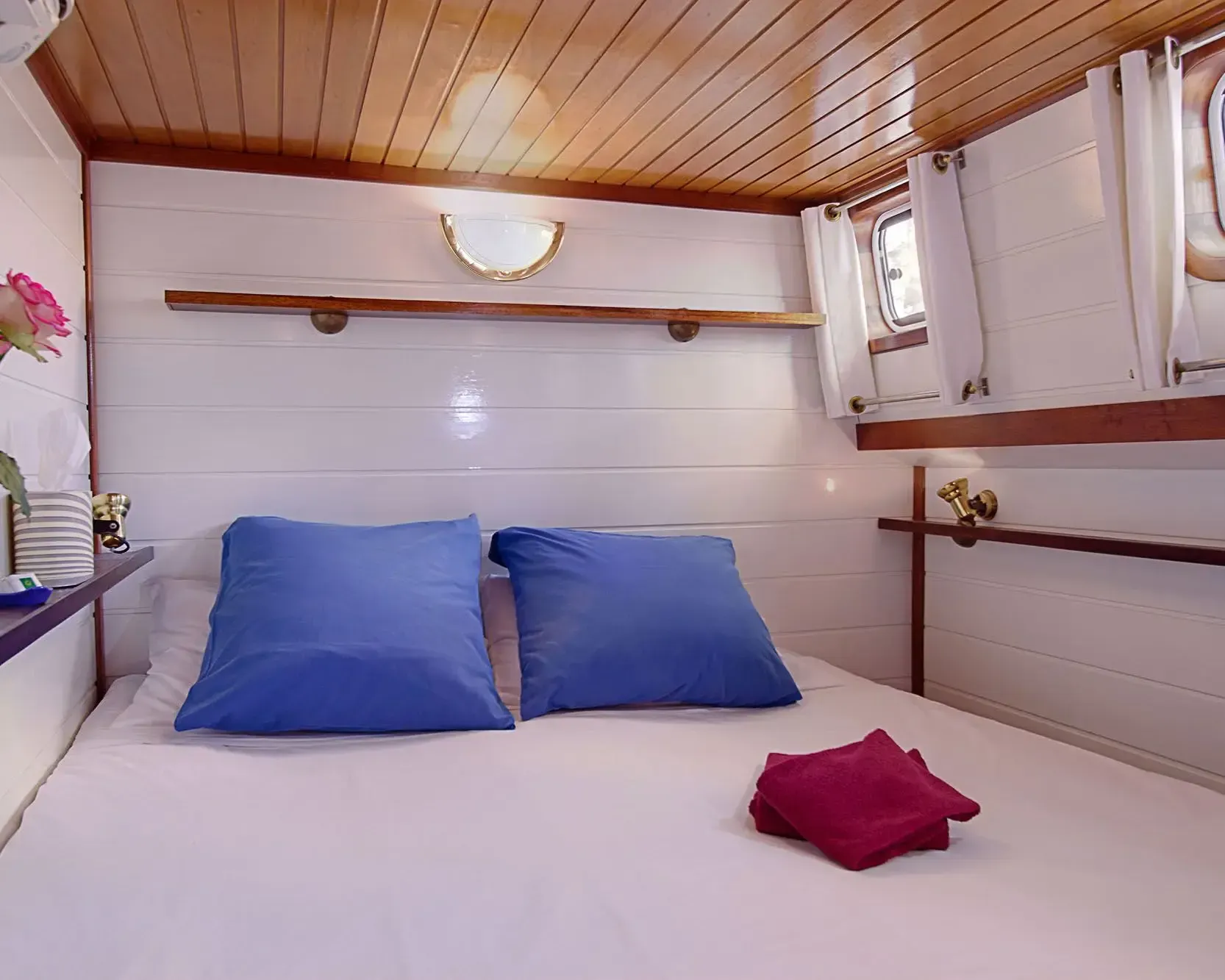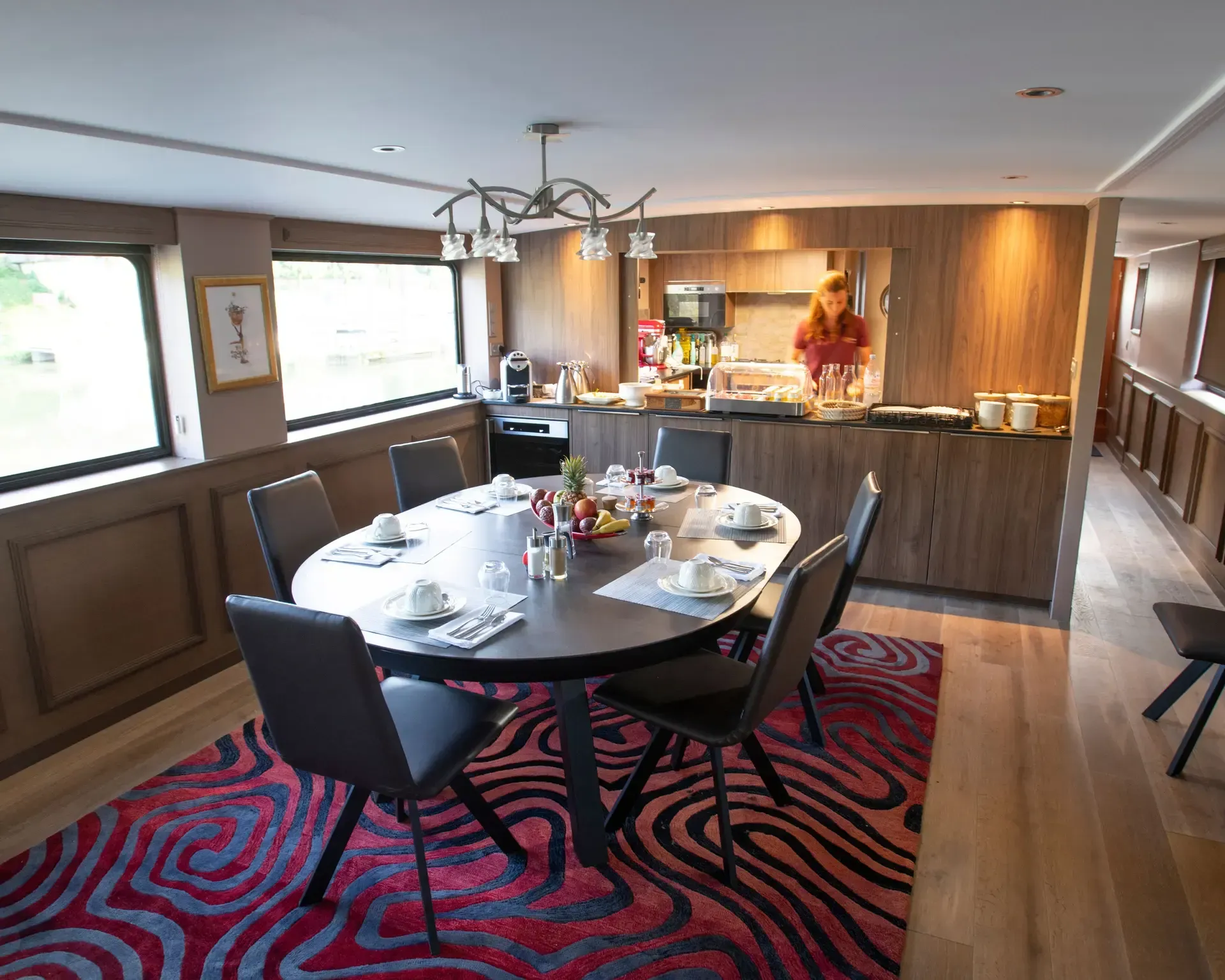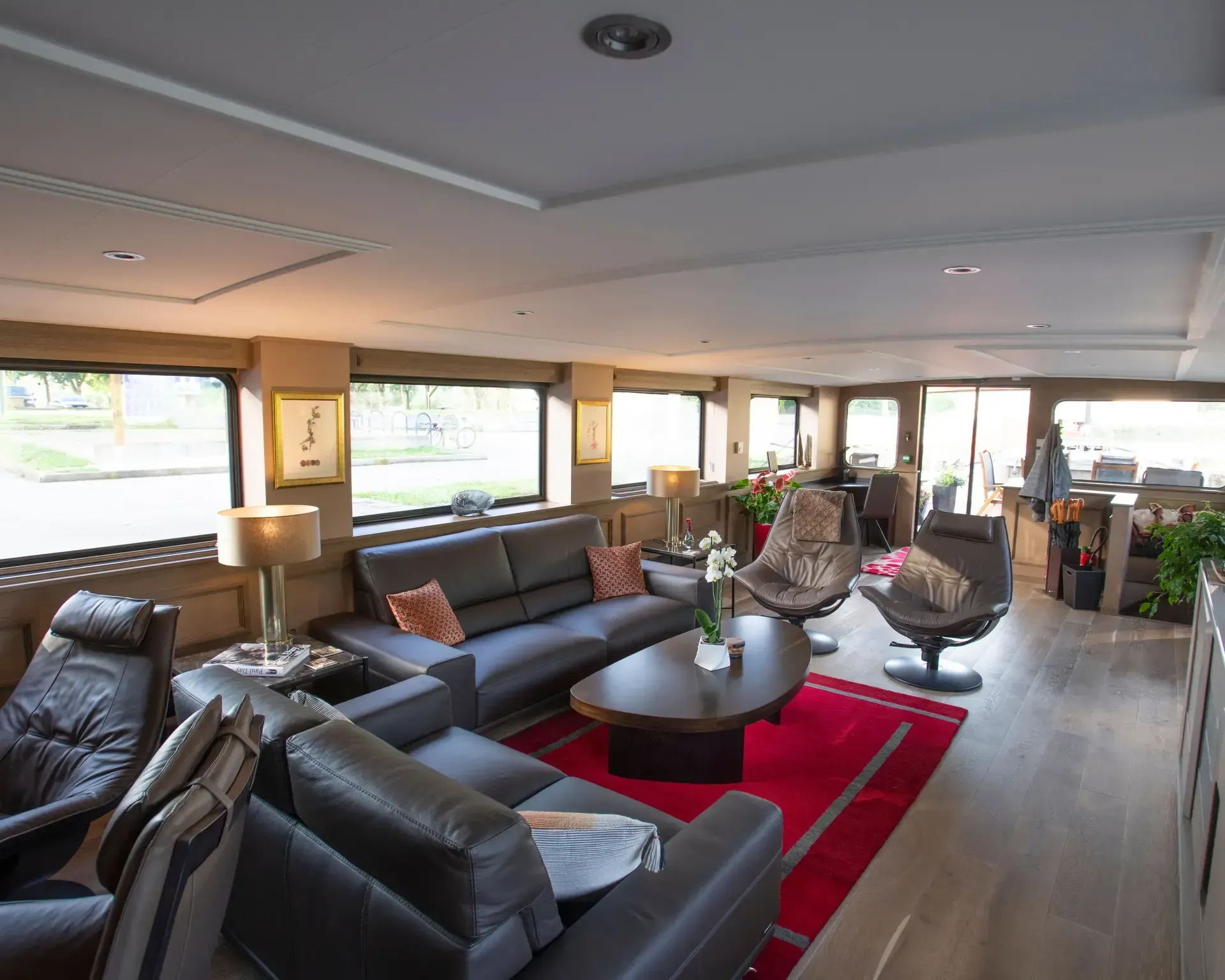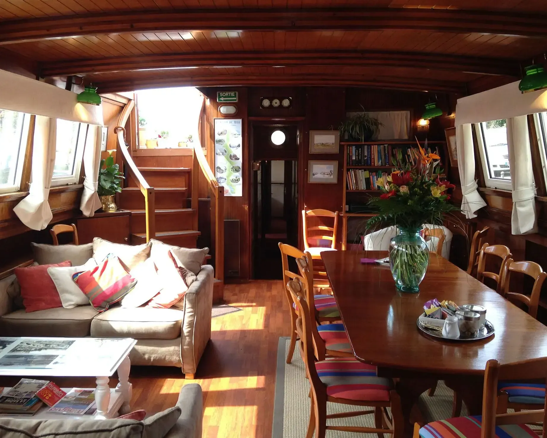 Sleeps four guests in two king/twin cabins, all with outside views and en suite bathrooms. Relax on the sun deck or cycle along the scenic towpath. A panoramic salon equipped with a stereo system, TV, books, games and collection of CDs and DVDs. Crew of four ensures personalized service. Partially shaded sundeck, ideal for outdoor dining. Bicycles are provided for a relaxing ride along the towpath