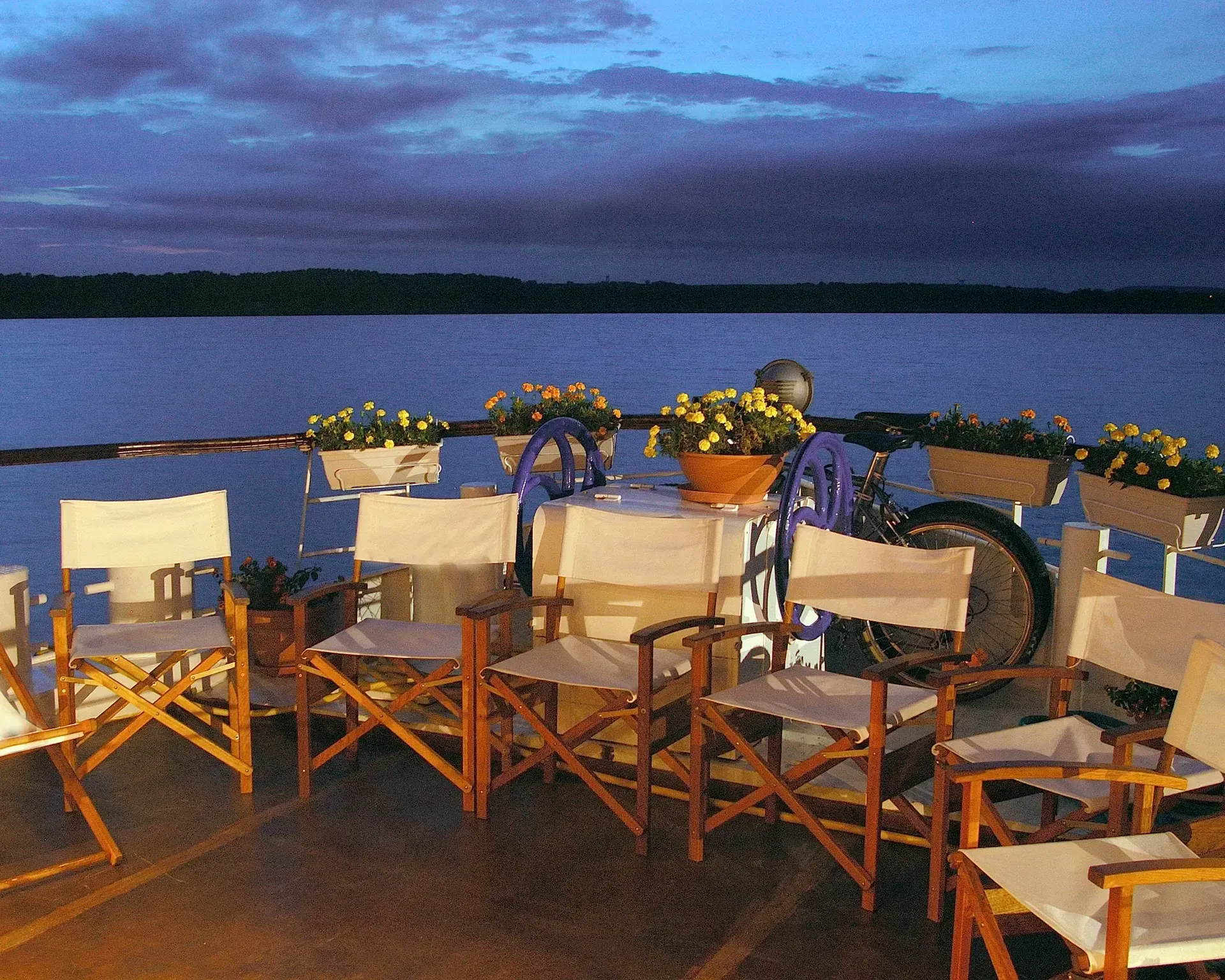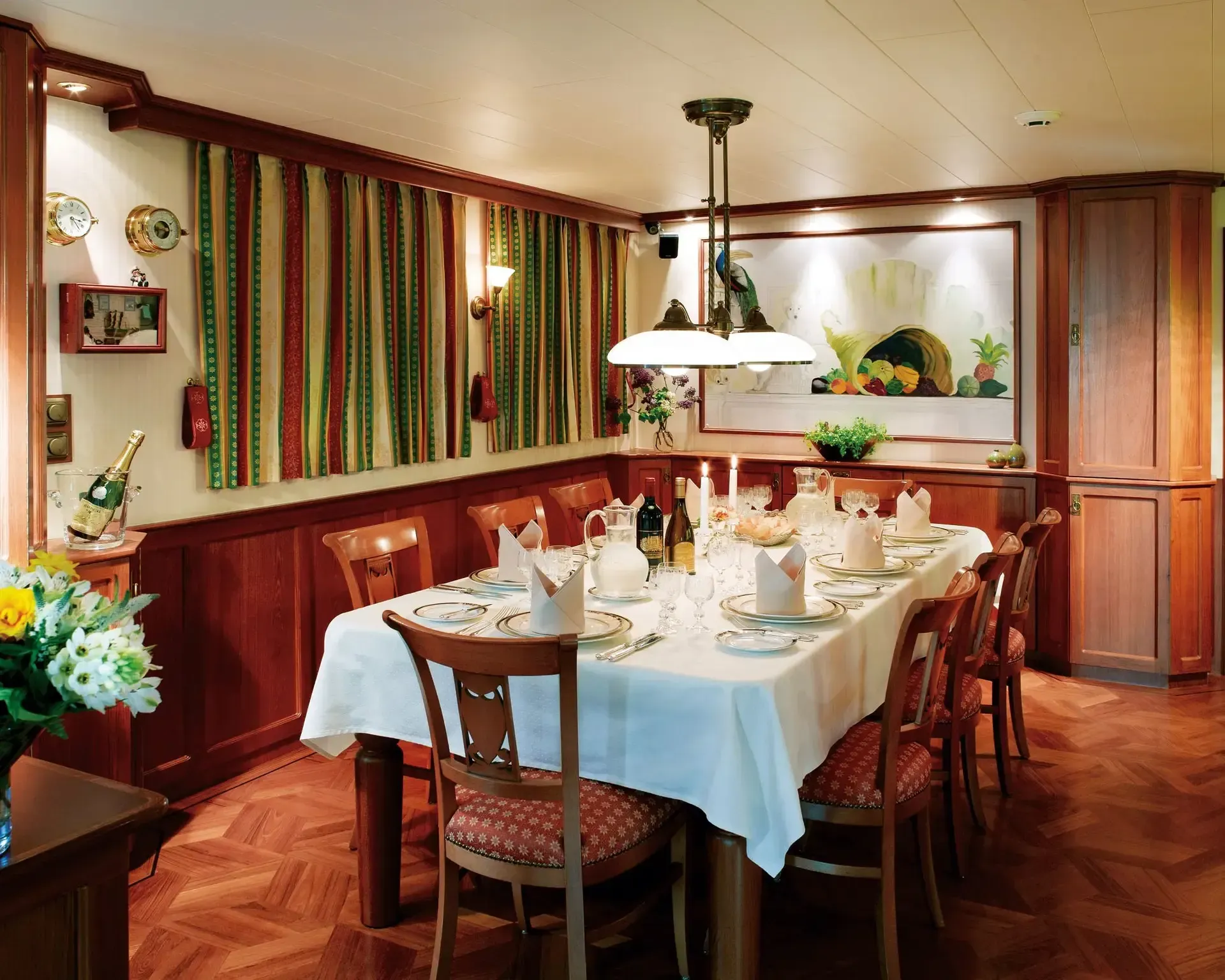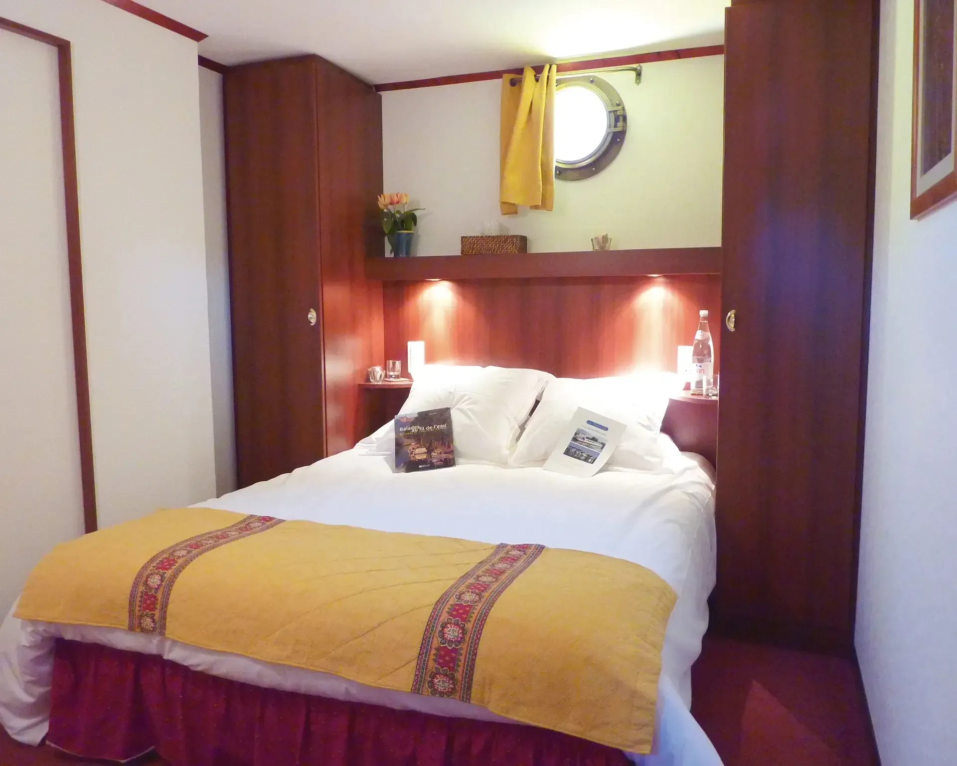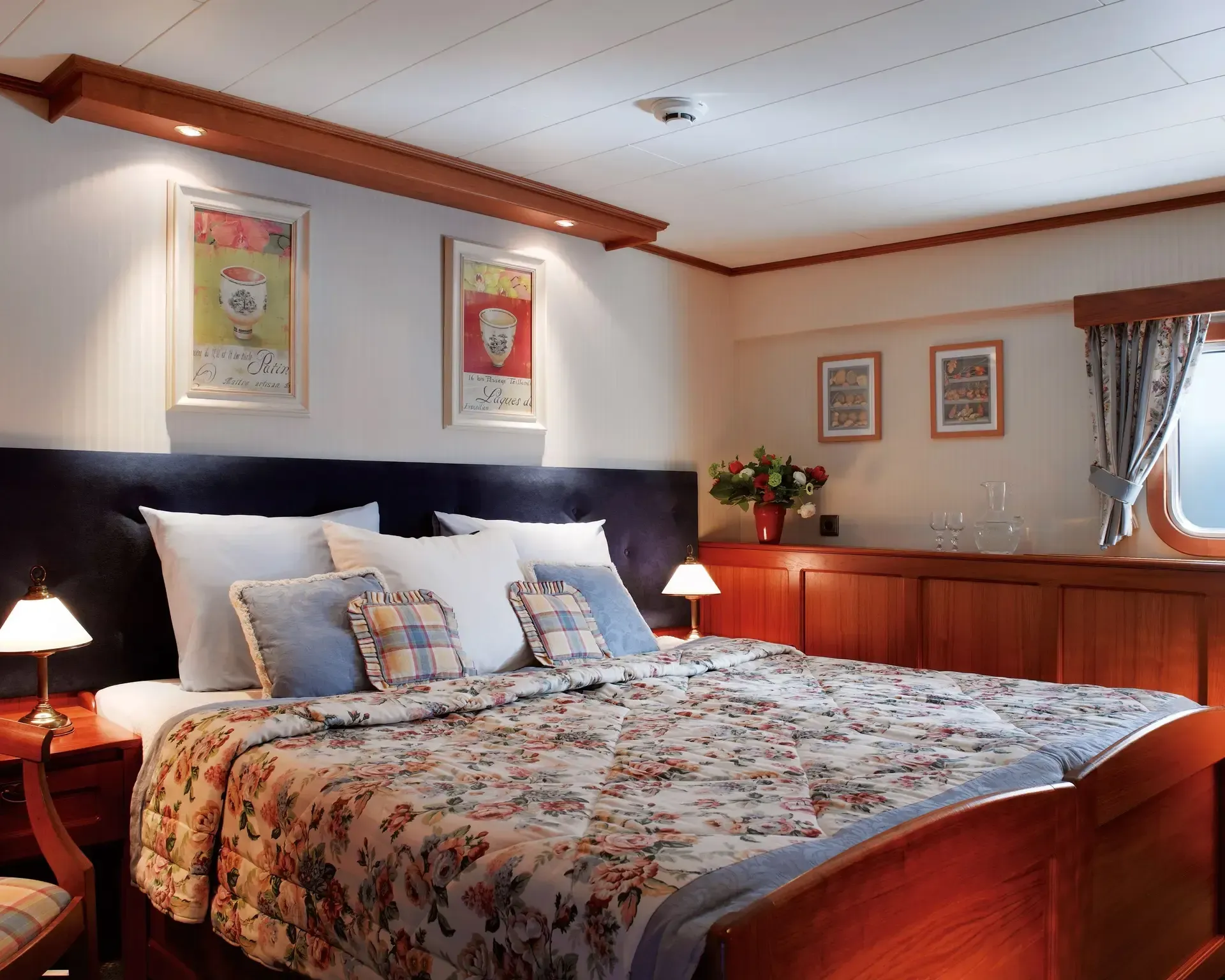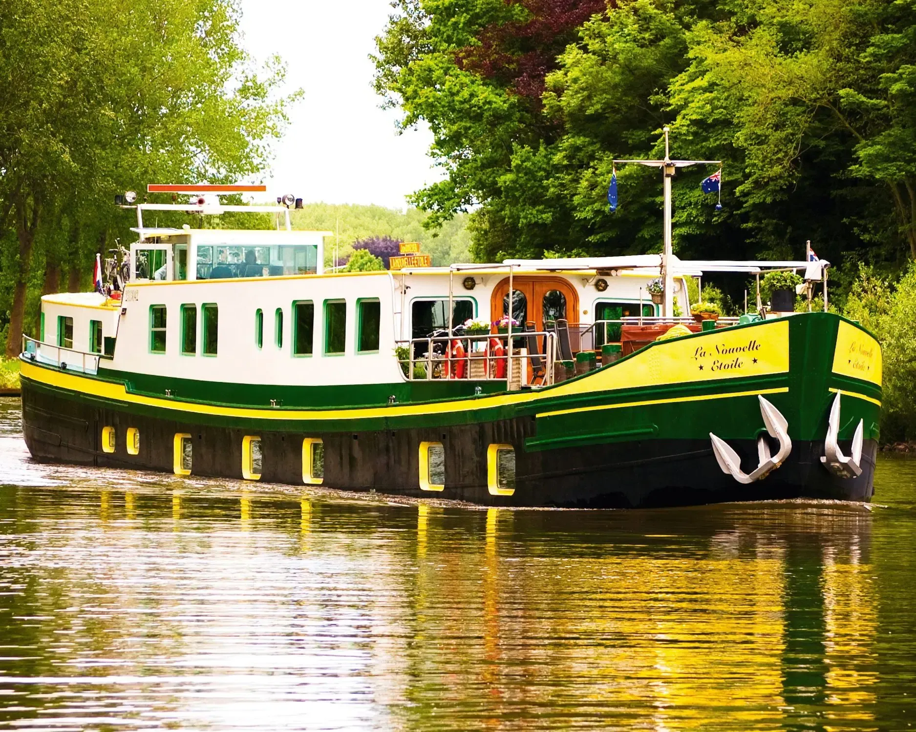 The hub of onboard life is the salon, featuring a bar, sound system and assortment of CDs. Head to the partially covered sun deck for open-air dining. Bicycles are on hand for a relaxing ride along the towpath. Sleeps 10 in five queen/twin cabins, each outward facing with en suite bathroom. A crew of five keeps everything on board running smoothly.