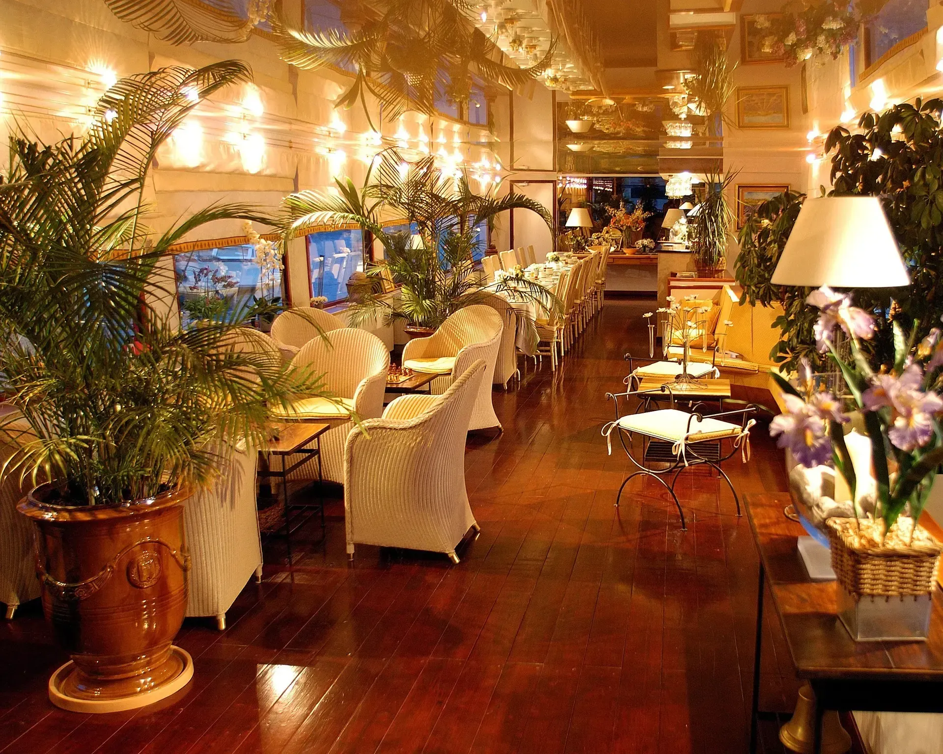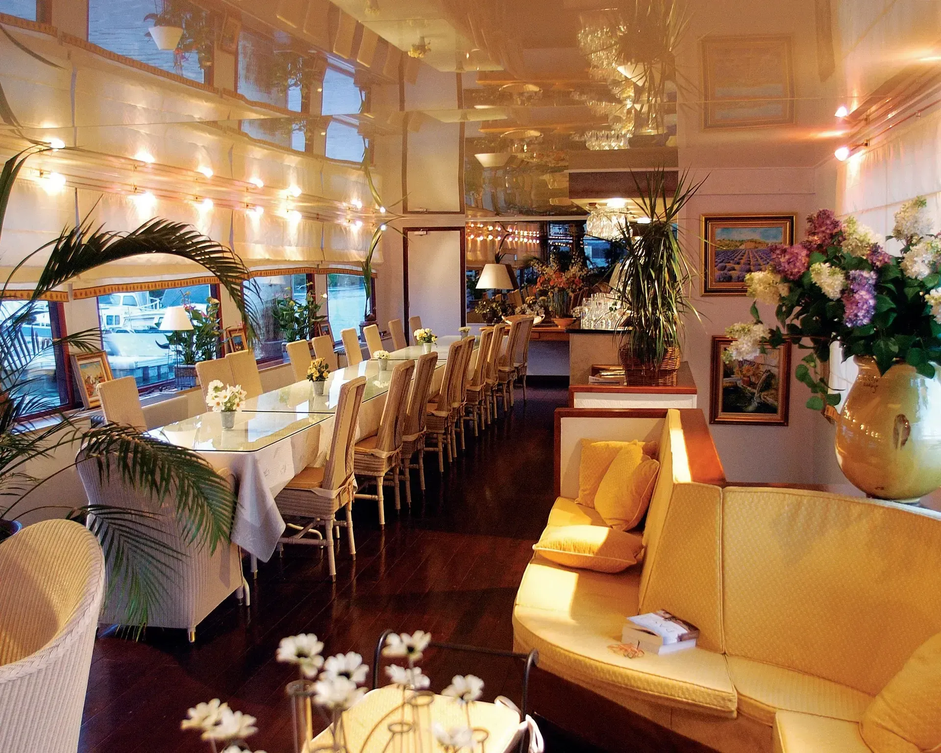 Spacious open interior flows from the salon with piano and open bar through to the dining room where the gourmet meals are enjoyed.