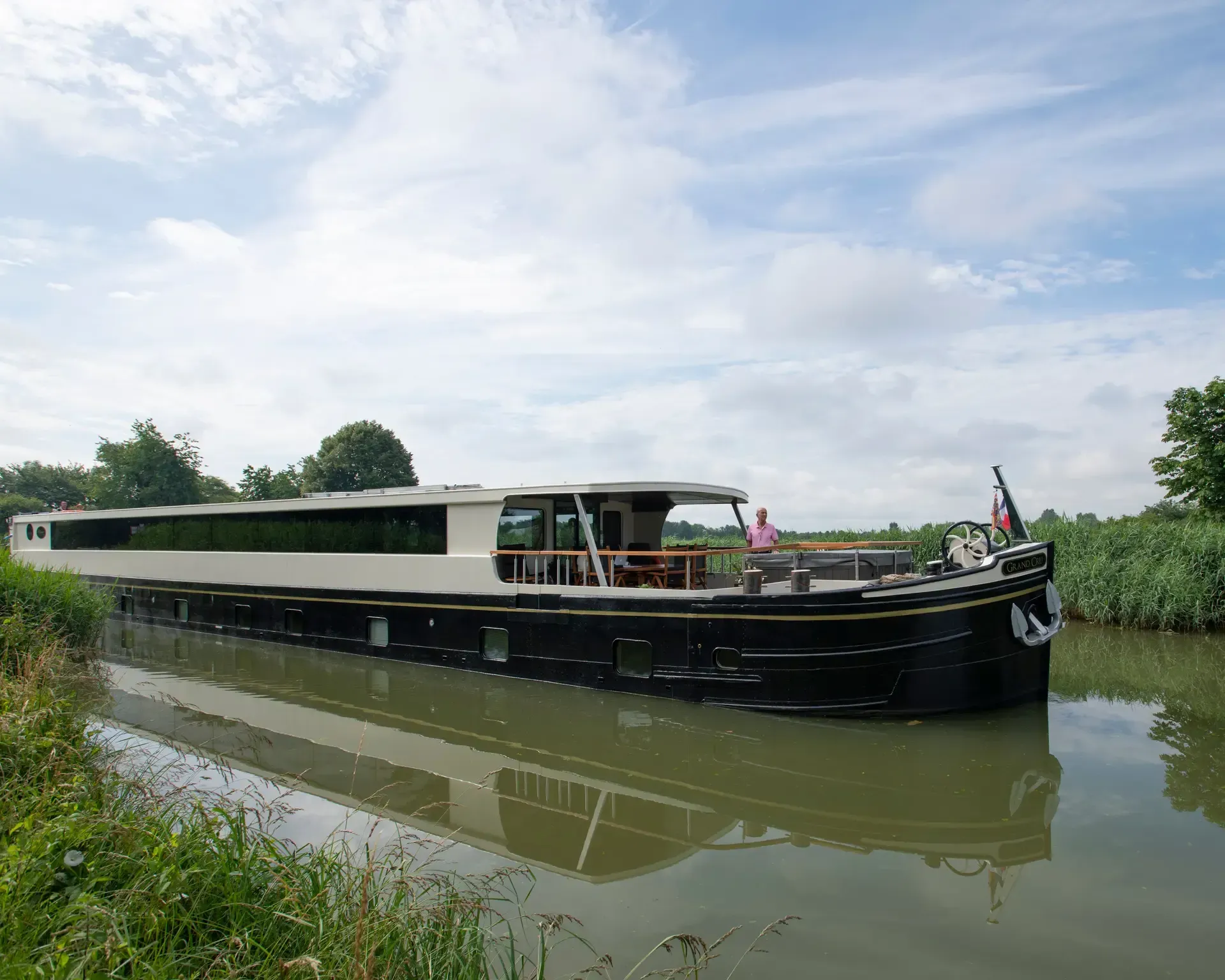 Sleeps six guests in three double cabins, all with outside views and en suite bathrooms. Salon equipped with two lounges and a bar. The heart of onboard life is the salon, featuring two lounges and a bar. Crew of five ensures your comfort on board. Bicycles are on hand for a relaxing ride along the towpath. Head to the partially covered sun deck for open-air dining.